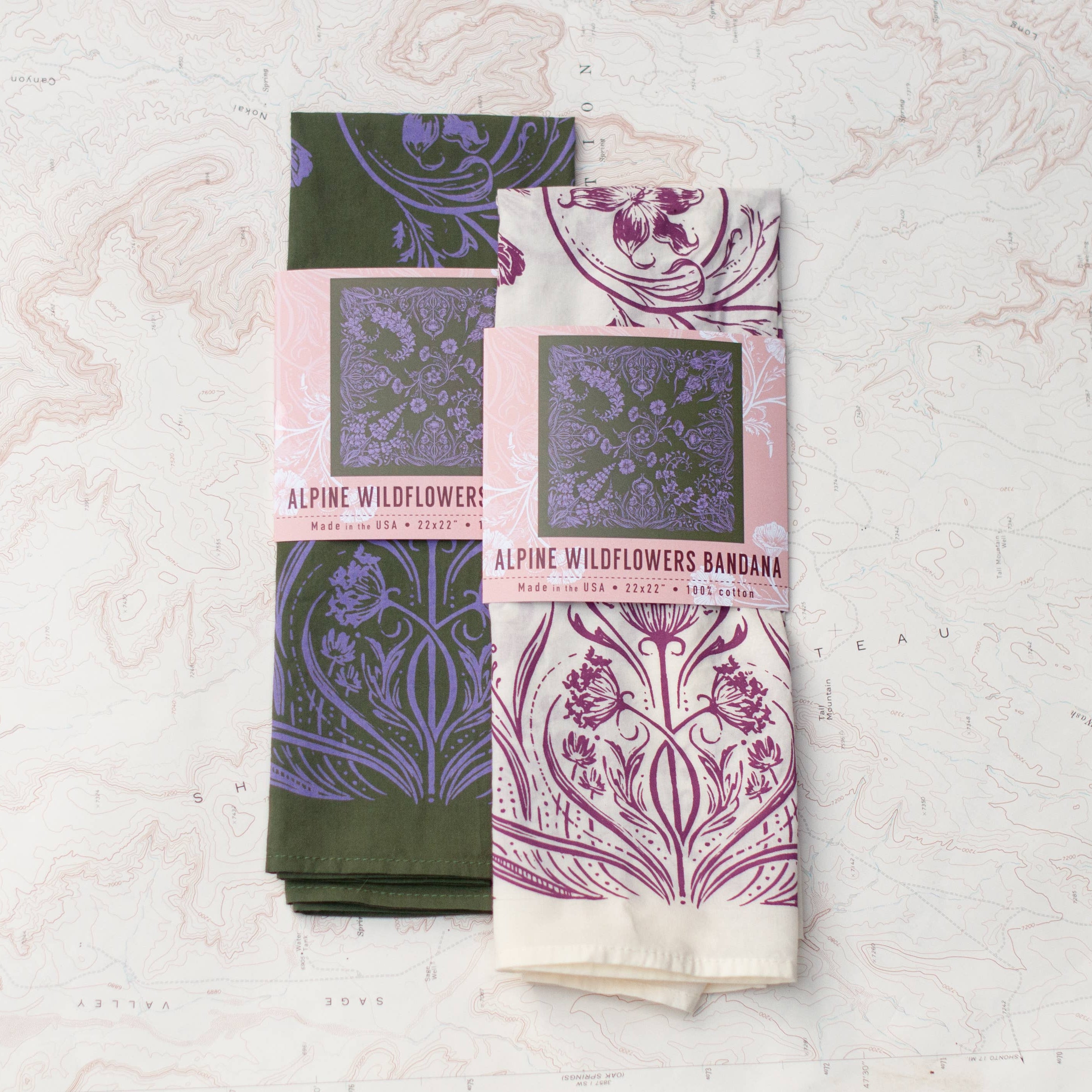 This super soft outdoor bandana features alpine wildflowers. Flowers include lupine, paintbrush, foxglove, poppies, trillium, and fireweed. Perfect for adventurers, hikers, backpackers and mountain lovers.