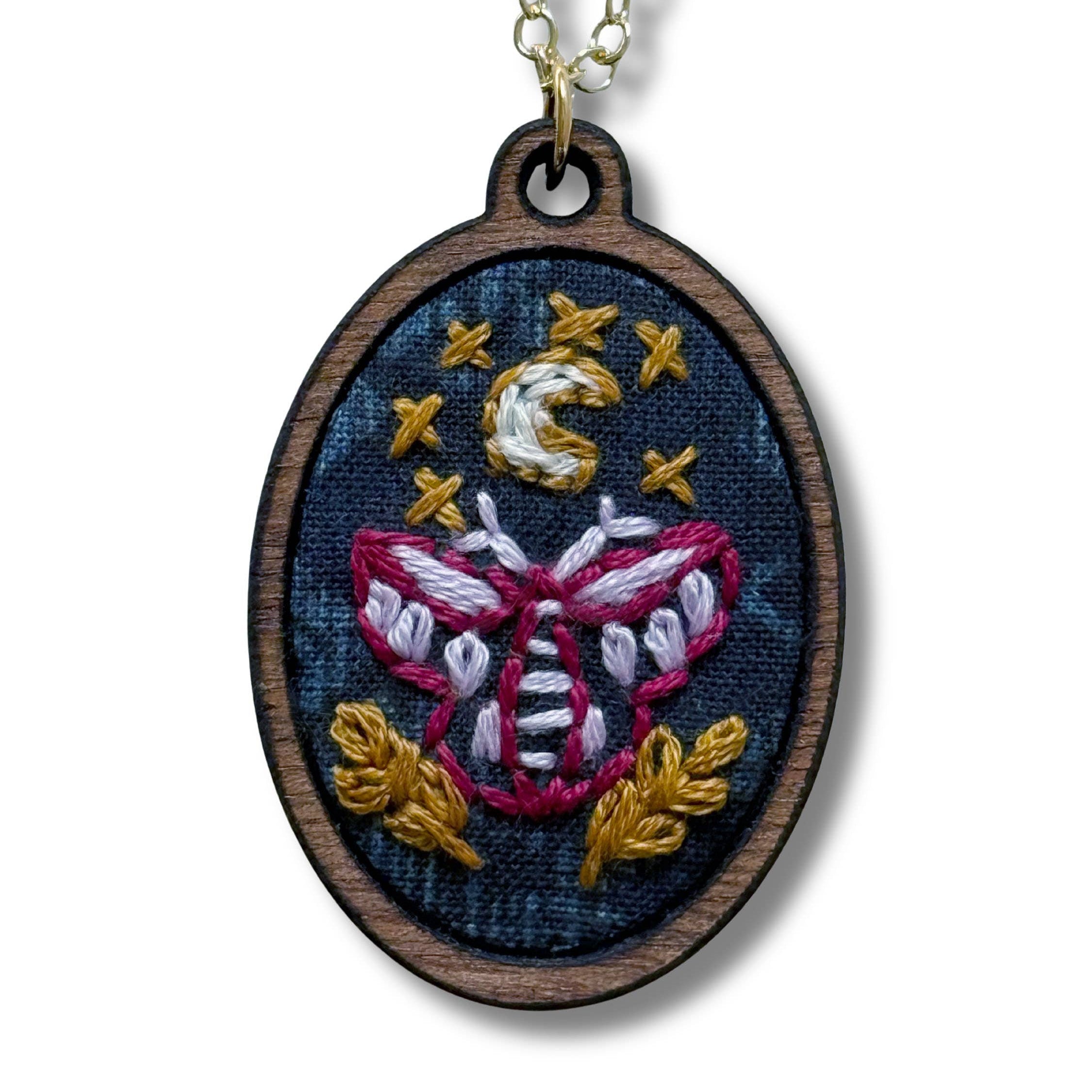 Your kit comes with: 6 inch hoop, fabric, needle, stitck and stitch water soluble design, two piece 2 inch wood charm, 24" necklace chain, instruction sheet, floss.