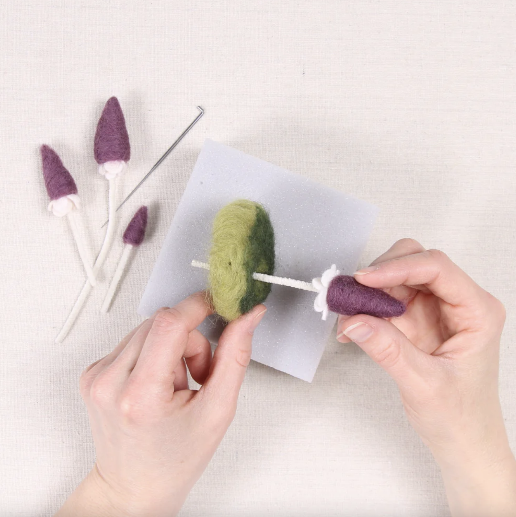 Adorned in ruffles and dainty dots -this family of fungi is the easiest of our mushrooms to make! The Pixie Parasol needle felting kit includes all the supplies to make your own mushroom family: felting needle, foam cushion, roving, cotton stems, felt accents, dowel and a wood turned bowl. You will need scissors or wire cutters. Glue is optional. A helpful instruction sheet includes step by step instructions that even a beginner can use!
