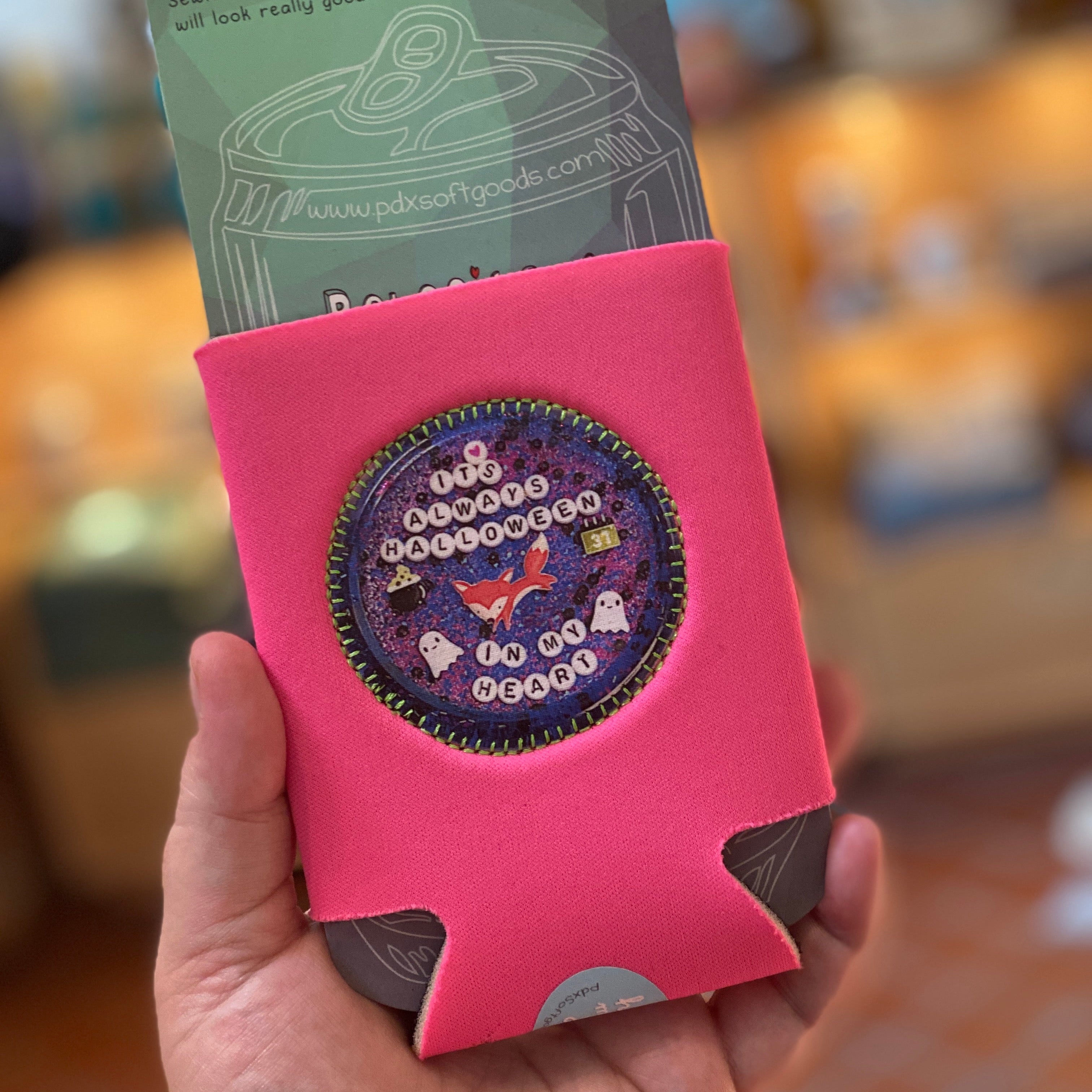 This front of the drink holder says, "It's Always Halloween In My Heart" and has a picture of one of our Shower Art pieces.