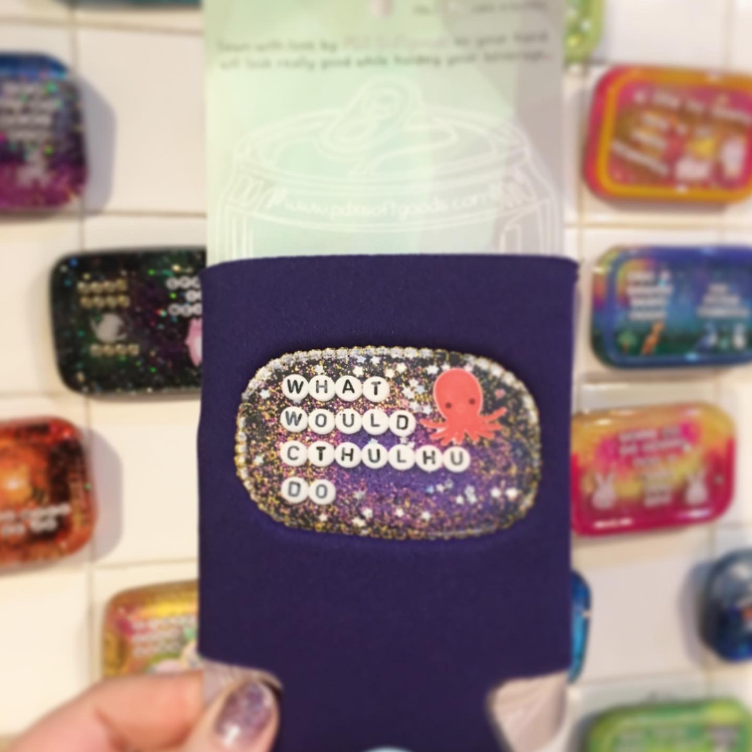 This front of the drink holder says, "What would cthulu do?." and has a picture of one of our Shower Art pieces. The back of the drink holder is machine embroidered and it says "wwcd?".