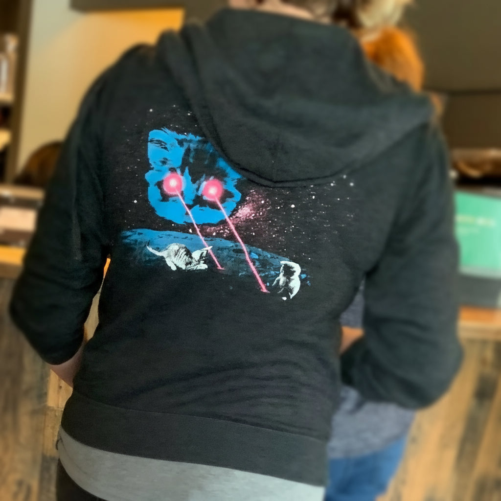 Printed on a heather dark gray Bella & Canvas unisex style zip front hoodie.