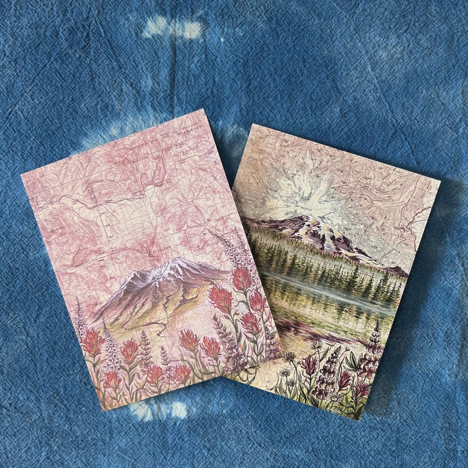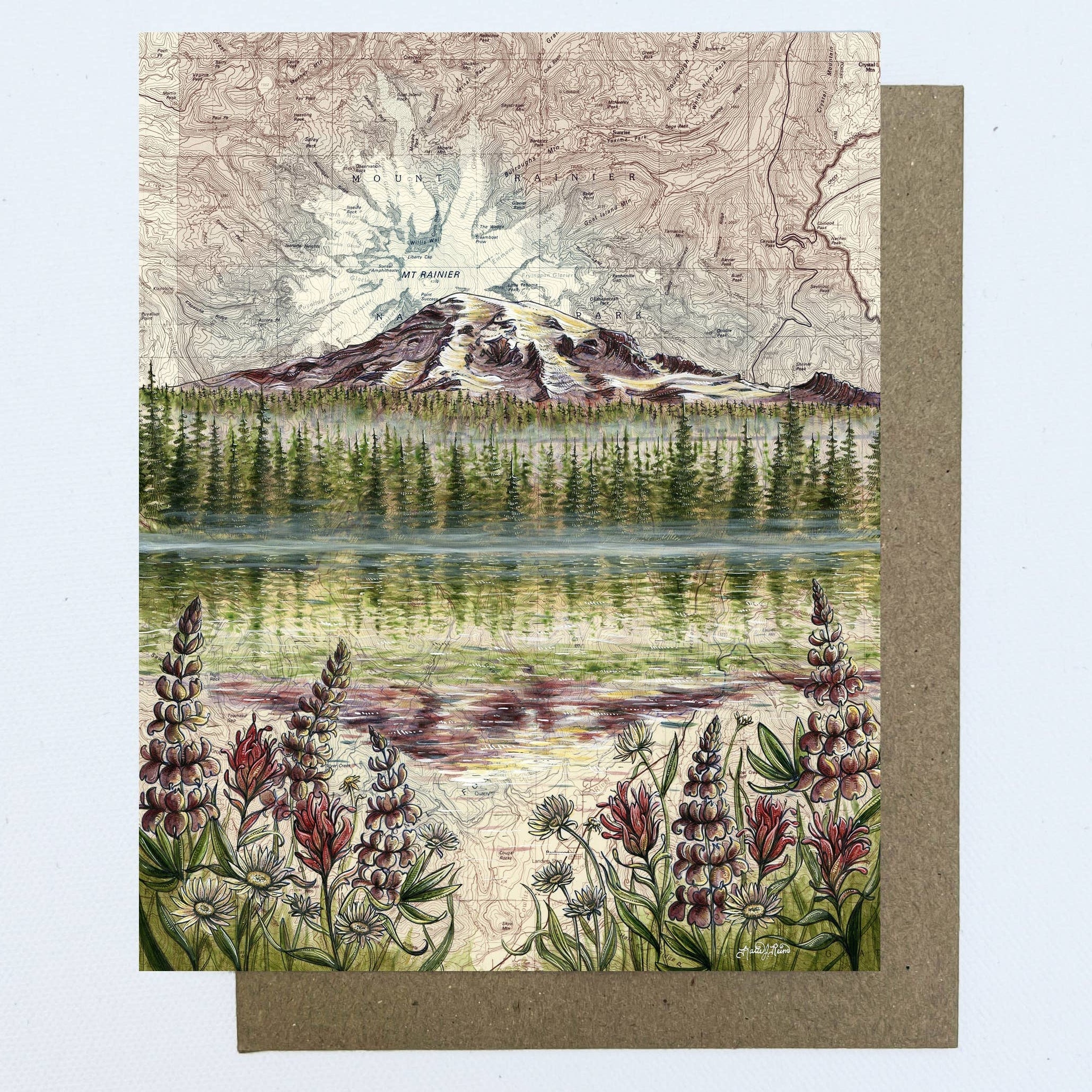 Reflection Lake in Mount Rainier National Park is featured in this painting on a vintage map. Wildflowers frame this iconic lake in Washington.