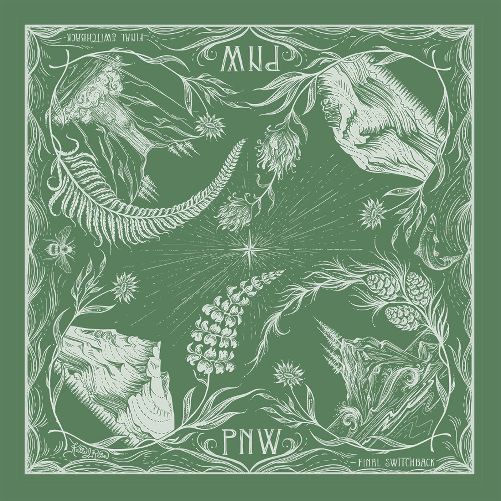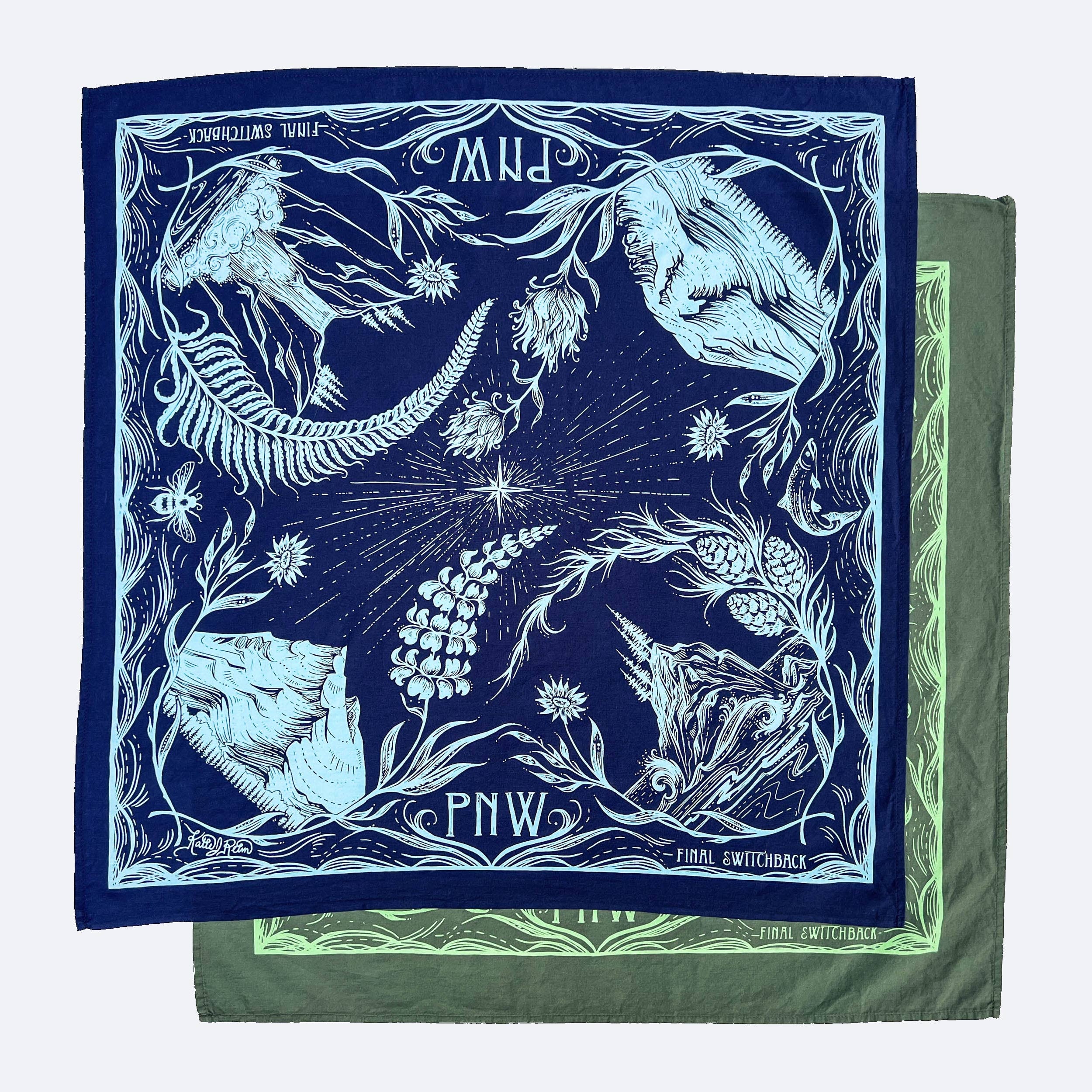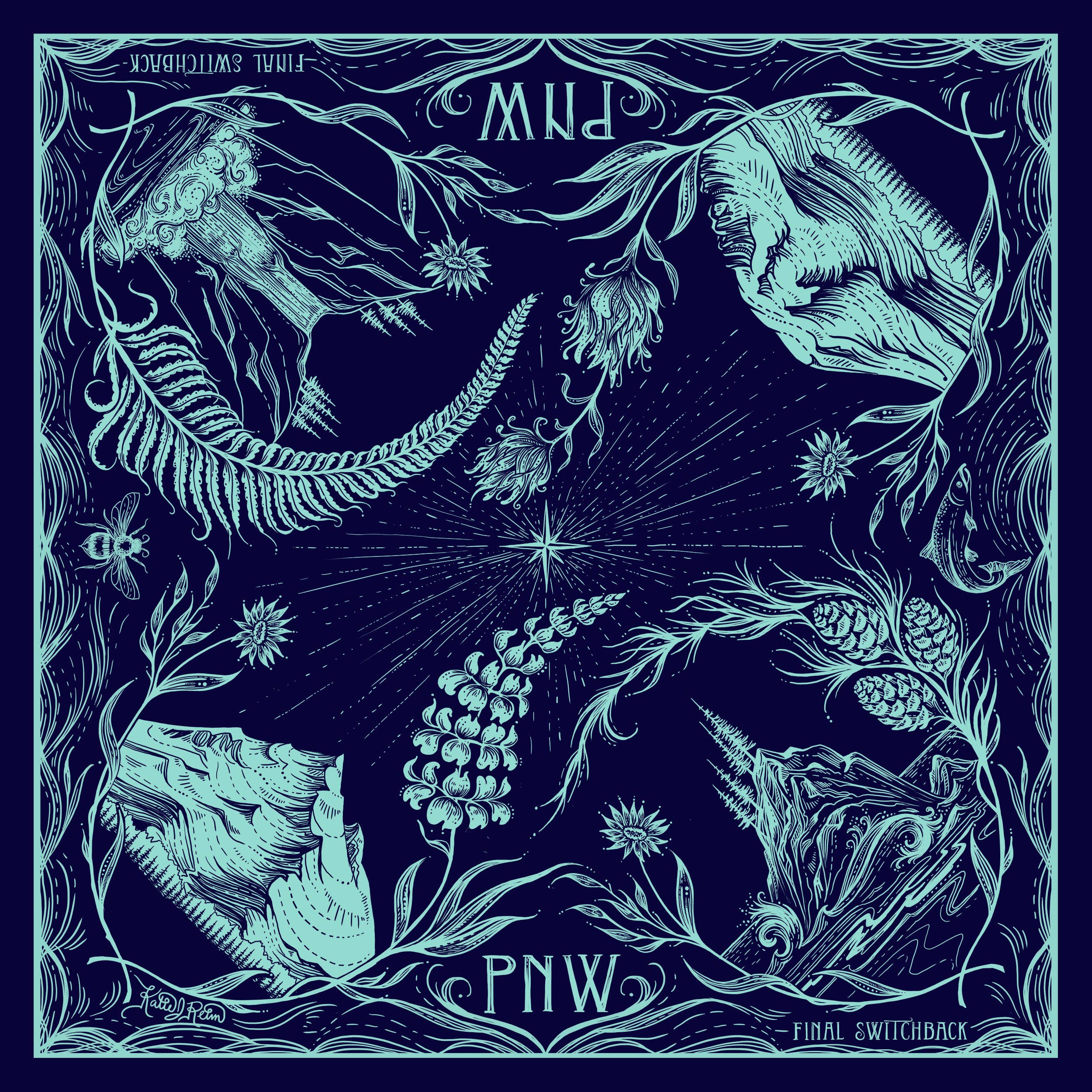 This Pacific Northwest bandana features some wilderness highlights from the area, including Mt Hood, Mt Rainier, Gorge Waterfall and a Pacific Ocean seastack, ferns and wildflowers. Perfect for adventurers, hikers, backpackers and mountain lovers.