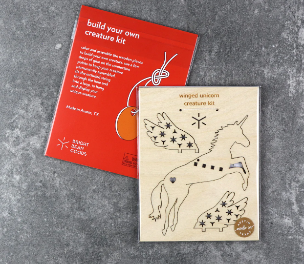 This birch wood kit comes flatpacked for easy shipping and gifting. While it does include a string to hang your masterpiece with, we suggest adding a dab of glue here and there if you aren't intending to store it flat after you complete it. Unassembled, each kit measures 4 1/2"x5 3/4" and arrives in a clear plastic sleeve.
